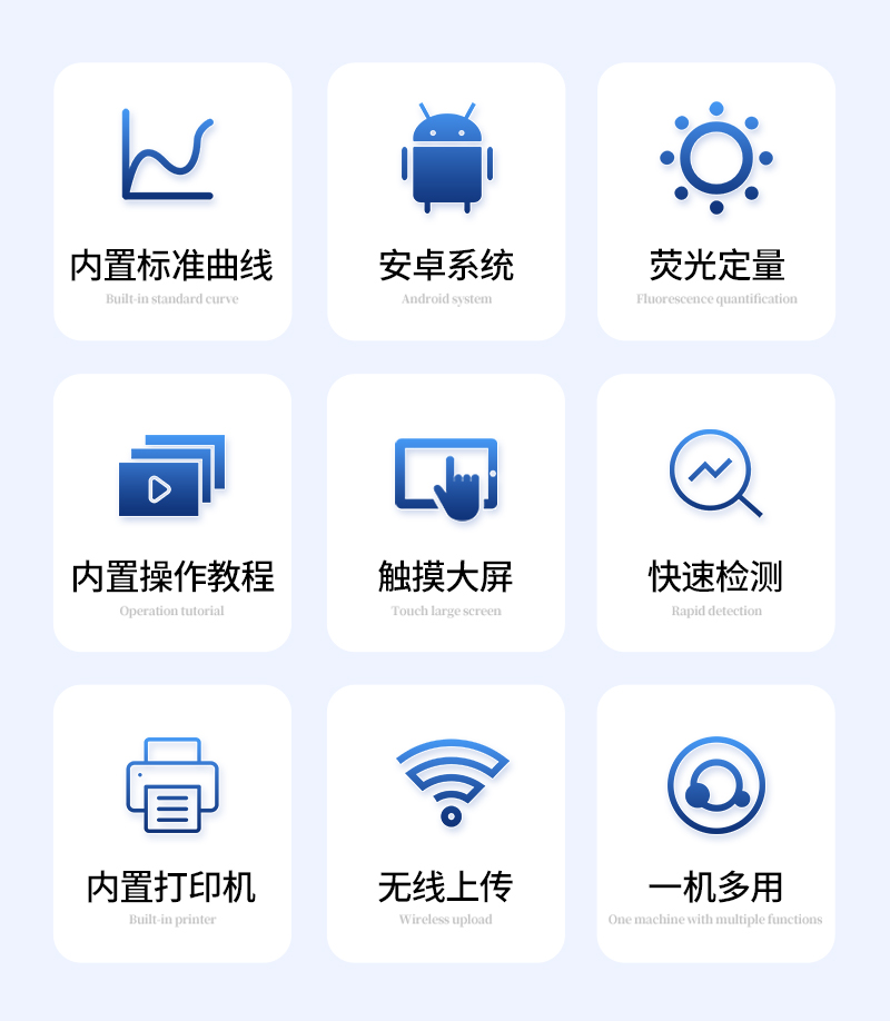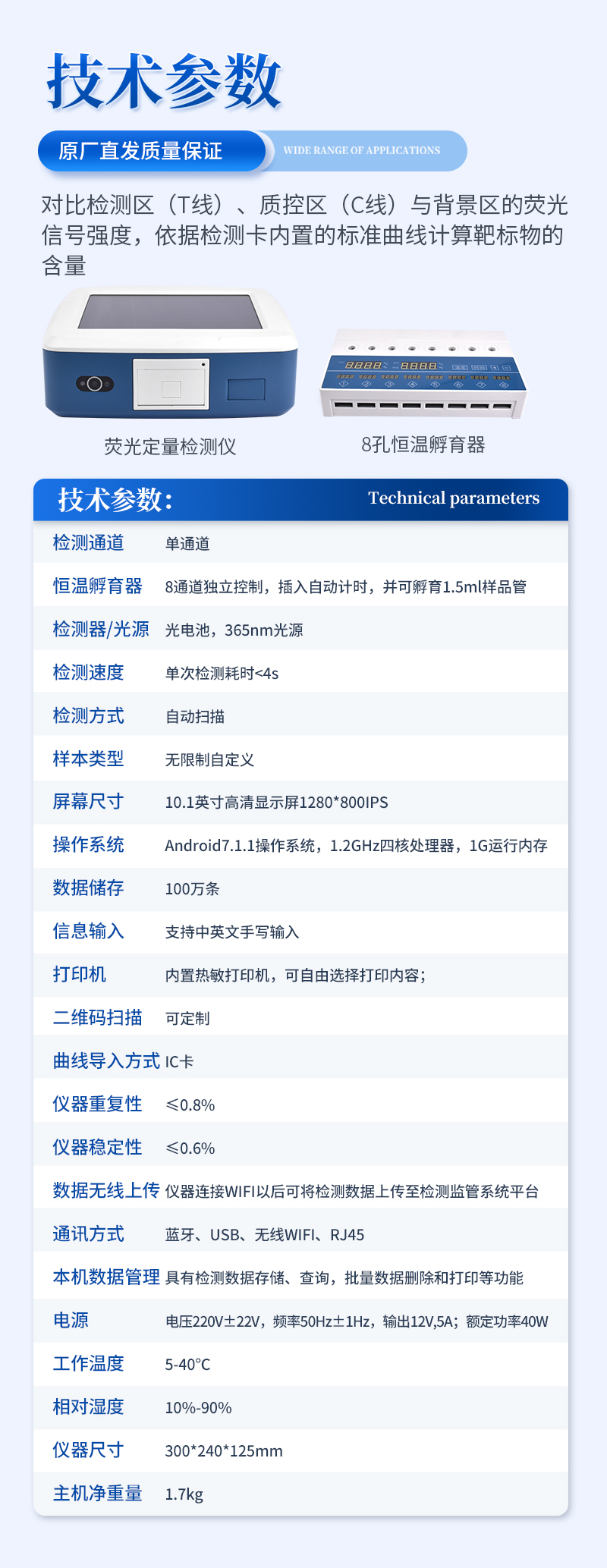 2、穩定性**:采用進口熒光微球,顆粒均一,從源頭保證產品穩定性好,批次內、批次間重現性好;配備8孔恒溫孵育器,一條一孔,自動計時,蜂鳴提醒,不受外界溫濕度影響,適用場地更廣;