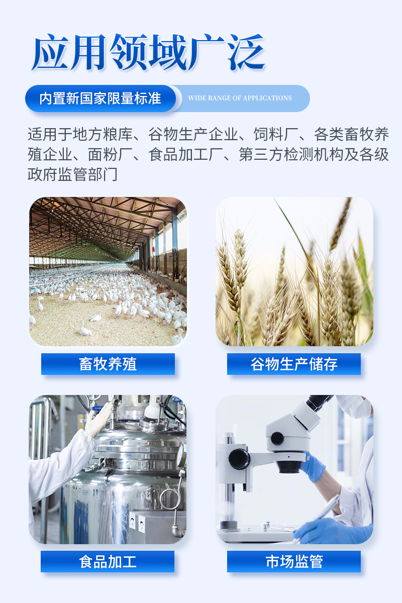 熒光定量真菌毒素快速檢測儀采用熒光定量快速檢測原理,主要檢測糧油谷物飼料中真菌毒素含量,包括黃曲霉毒素B1、黃曲霉毒素M1、玉米赤霉烯酮、嘔吐毒素、伏馬毒素等等,檢測樣品涵蓋糧食谷物(大米、玉米、小麥、大麥、高粱等)及其制品、飼料及其原料、食用油脂、牛奶及其制品等;樣品前處理簡單,整個檢測過程檢測12min,產品適用于地方糧庫、谷物生產企業、飼料廠、各類畜牧養殖企業、面粉廠、食品加工廠、第三方檢測機構及各級政府監管部門;